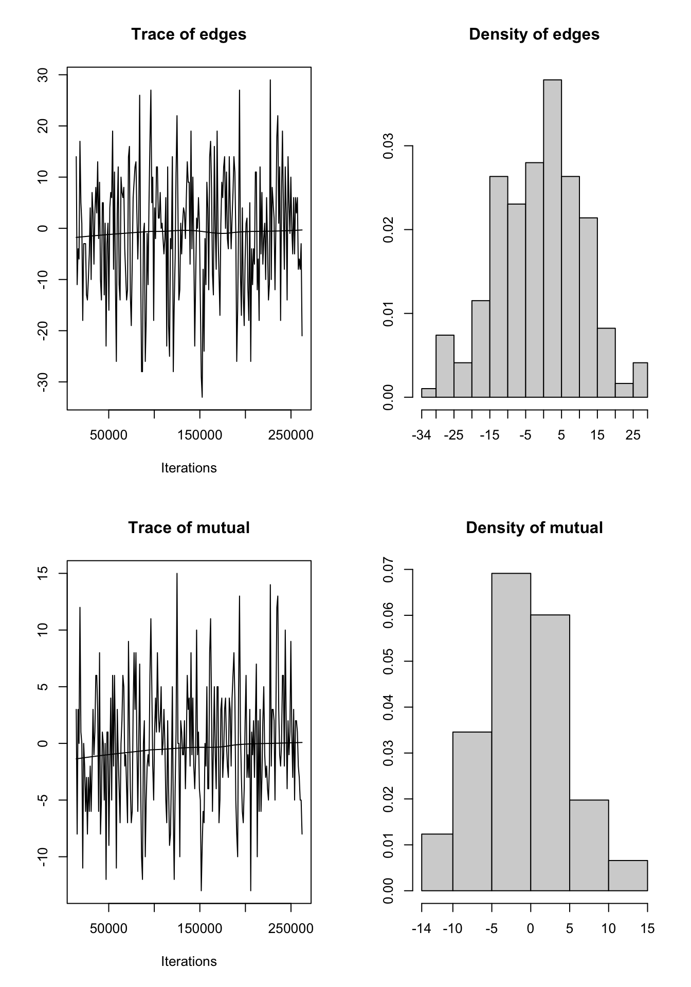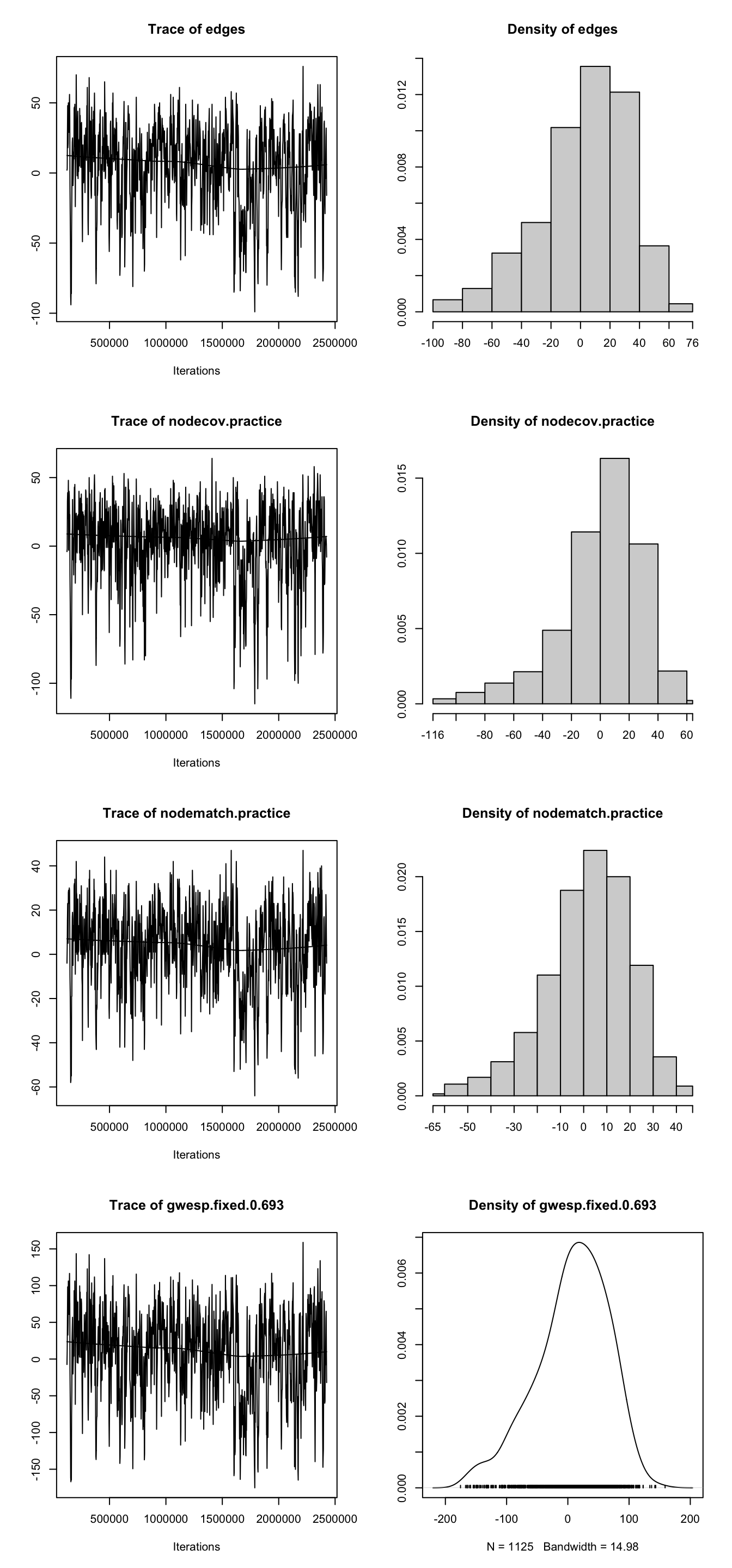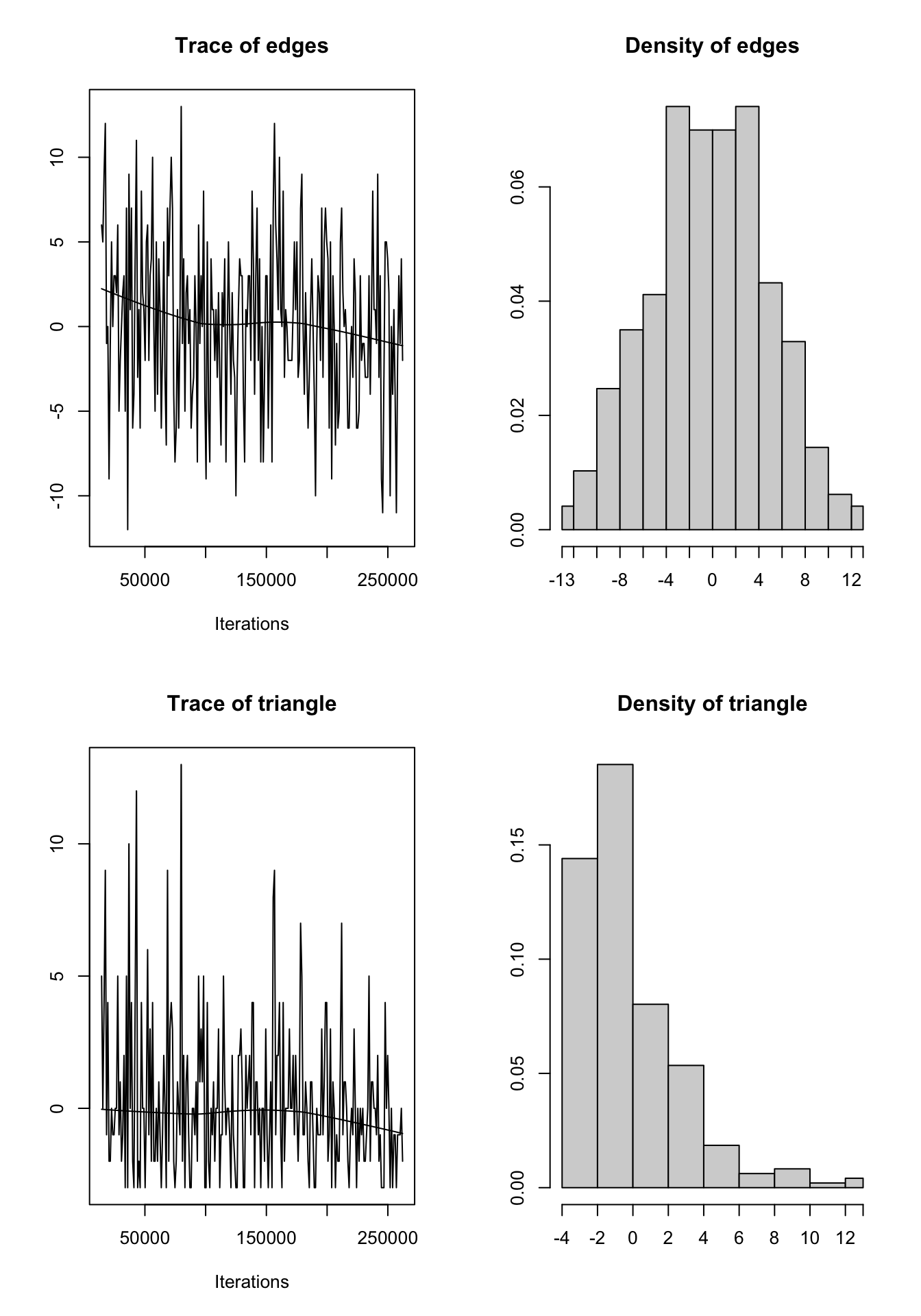 to observe the behavior of the MCMC estimation algorithm and check for degeneracy. What you want to see in the MCMC diagnostics: the MCMC sample statistics varying randomly around the observed values at each step in the trace plots (which means the chain is mixing well) and the difference between the observed and simulated values of the sample statistics should have a roughly bell-shaped distribution, centered at 0 (which means no difference):