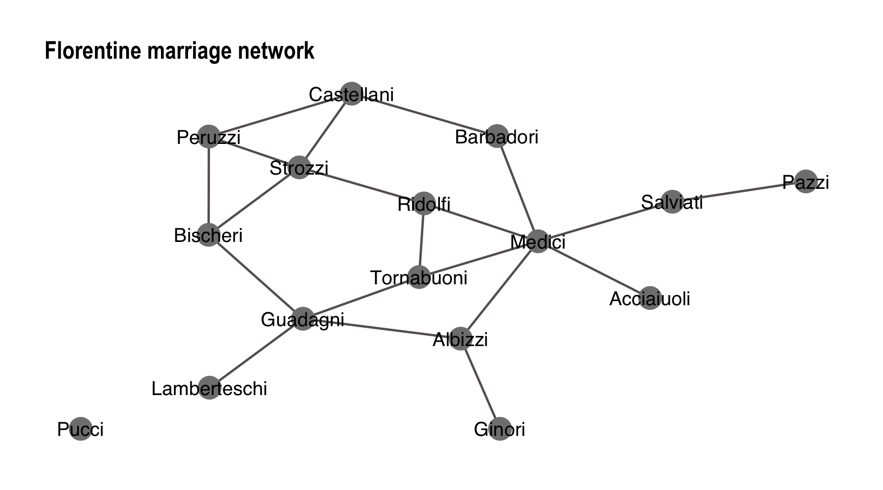 package) and create the adjacency matrix from the loaded network object. This is done with the below code. Note that we have some available node attributes: priorates, totalties, vertex.names and wealth. We’ll be using these attributes later for modeling ERGMs.